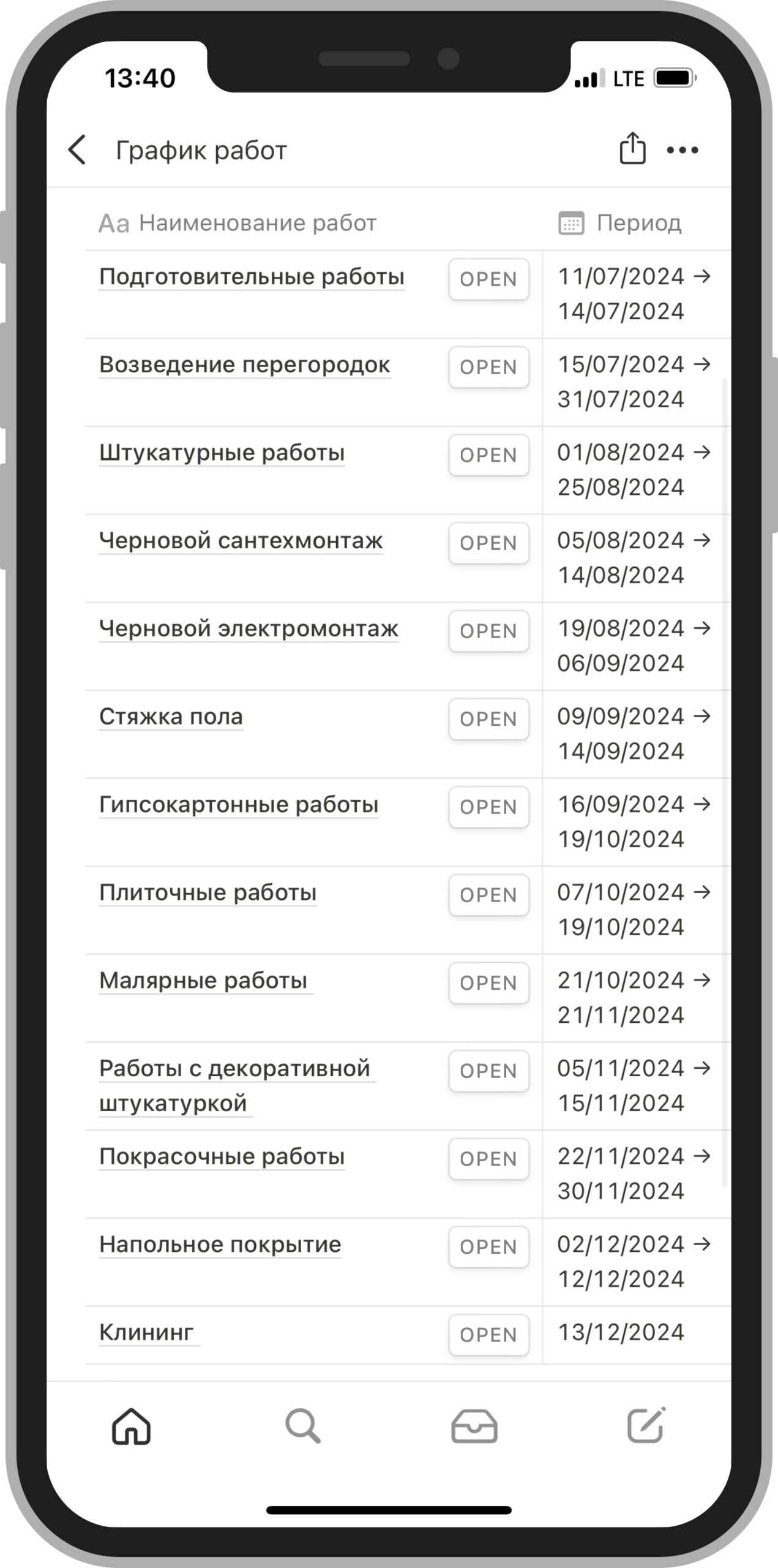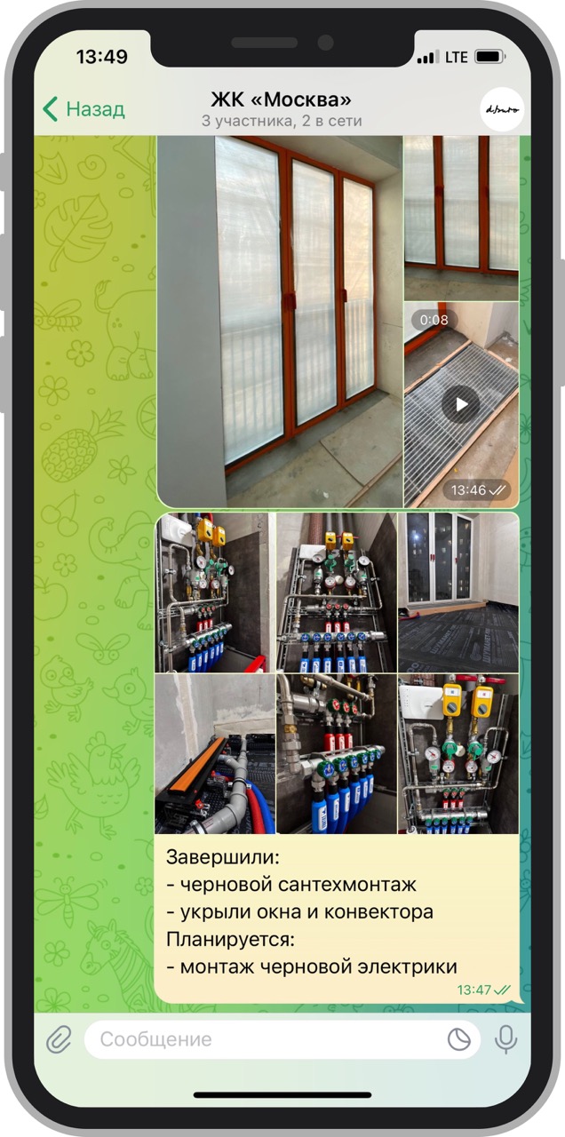 Контроль заказчика за финансами по проекту осуществляется через приложение 101, график отслеживается через Notion, видео-наблюдение за объектом по онлайн-камерам с круглосуточной трансляцией, обсуждение вопросов, замечаний и отчет по проделанной работе — в чате Telegram.