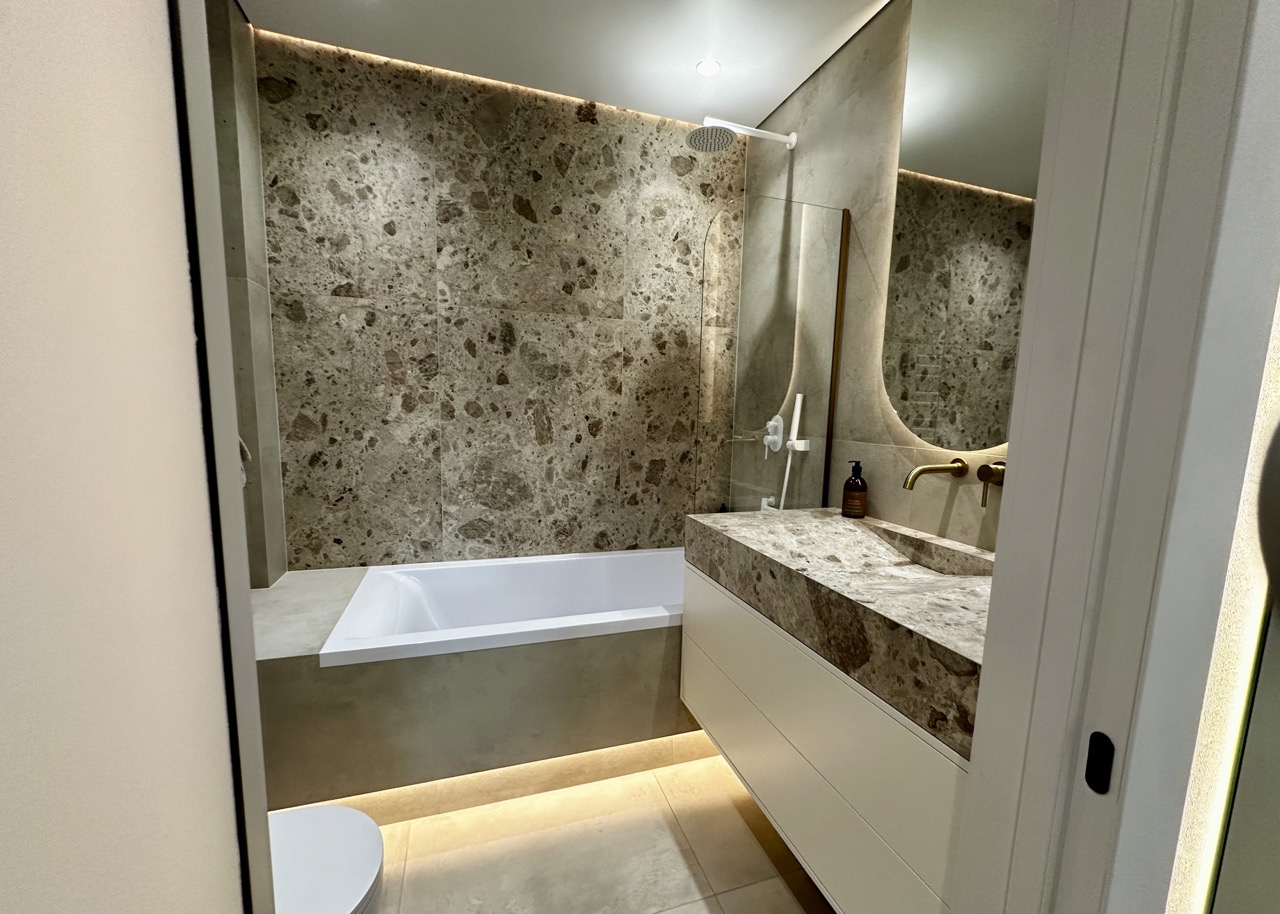 Плиточные работы: укладка широкоформатного керамогранита с подборкой рисунка, запил углов под 45° и эпоксидная затирка швов.